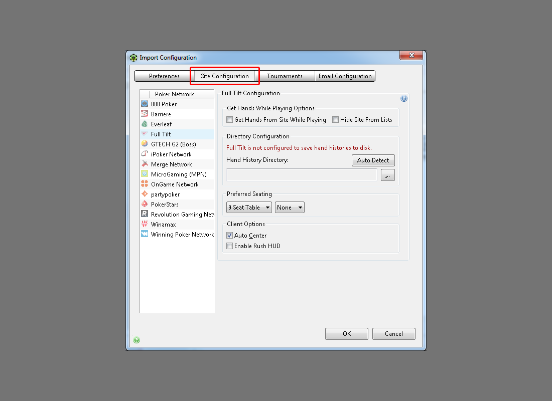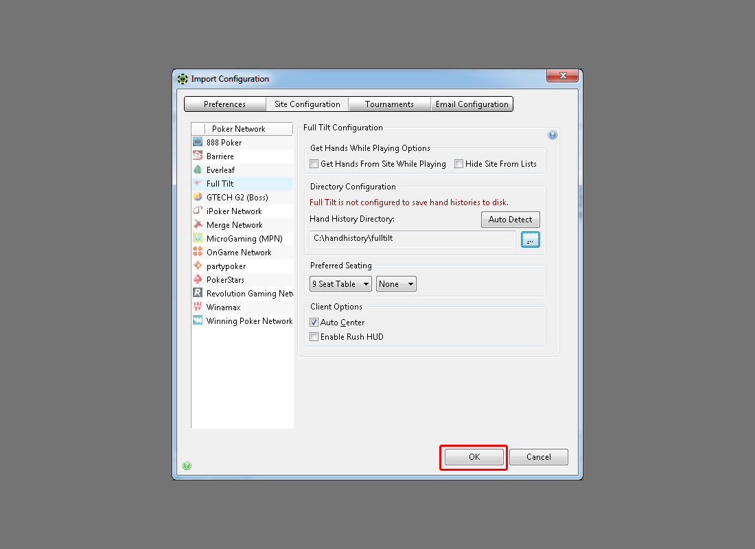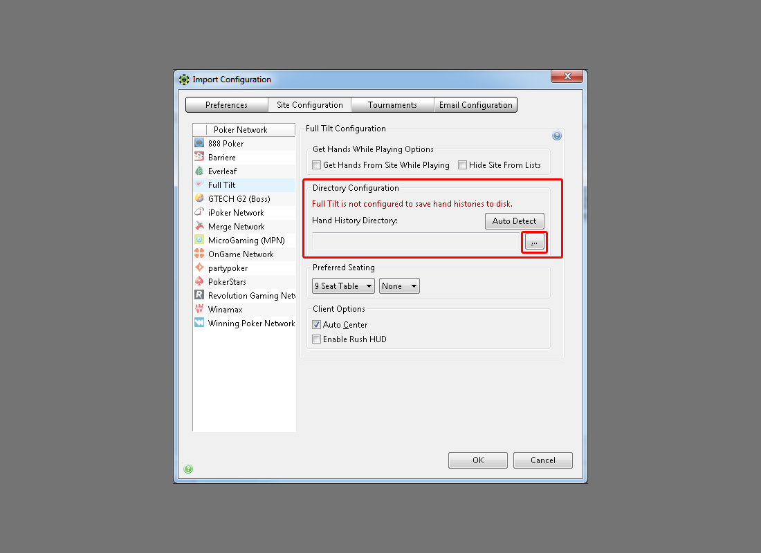 Select desired poker network from the list on the left (for example FullTilt). Take a closer look at the Directory Configuration section. Click on the small three dot button to open a folder browse dialog.